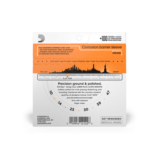 In quanto muta half round in fosforo-bronzo per chitarra acustica, le corde Flat Tops sono state specificatamente progettate per ridurre al minimo il rumore di sfregamento delle dita. Unendo il vero timbro delle fosforo-bronzo a sensazioni tattili di grande scorrevolezza e silenziosità, sono l’ideale per la registrazione e lo stile chitarristico slide. Le Flat Tops sono realizzate con un’anima in acciaio a elevata percentuale di carbonio e avvolte con cavo al fosforo-bronzo, quindi levigate e lucidate con macchinari di precisione per ottenere una corda semipiatta scorrevole e dal timbro ottimamente bilanciato. Le corde della muta Extra Light con scalatura 10-47 sono facili da suonare e consentono un ottimo bending.