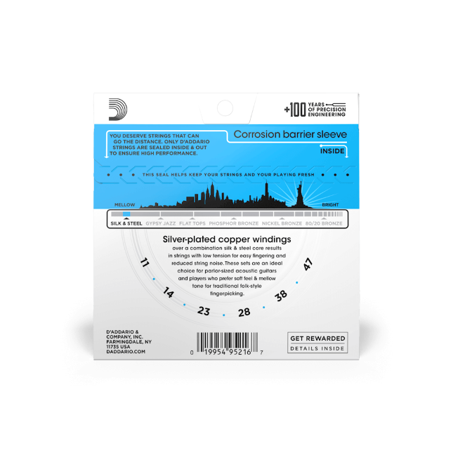 Le Silk and Steel sono state ideate appositamente per essere le nostre corde per chitarra acustica più calde e suadenti. Spesso preferite dai chitarristi folk, il timbro dolce delle Silk & Steel è l’ideale anche per chitarre da salotto e strumenti vintage. Realizzate con un avvolgimento in rame placcato argento su un’anima in seta e acciaio, la bassa tensione e il rumore di sfregamento ridotto delle Silk & Steel si adattano bene a stili musicali rilassati e al fingerpicking. Questa muta Light scalatura 11-47 è molto facile da suonare e si caratterizza per un timbro caldo.