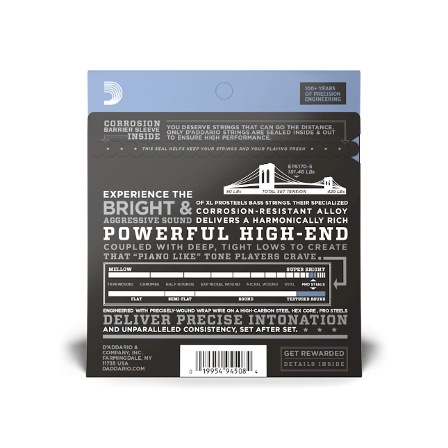 Le XL ProSteels sono le corde per basso più brillanti di D’Addario. La lega unica e altamente magnetica delle ProSteels offre un suono estremamente brillante con una presenza e un attacco amplificati. Realizzate con un’anima in acciaio ad alto tenore di carbonio e un filo avvolgente in acciaio inossidabile, le ProSteels producono un’interazione potenziata con i pickup magnetici, offrendo una gamma di alti armonicamente ricchi e brillantemente penetranti, combinati con bassi pronunciati, stretti e robusti. Progettato per bassi a 5 corde, il set Regular Light gauge 45-130 aggiunge una corda B bassa al nostro calibro per basso più popolare.