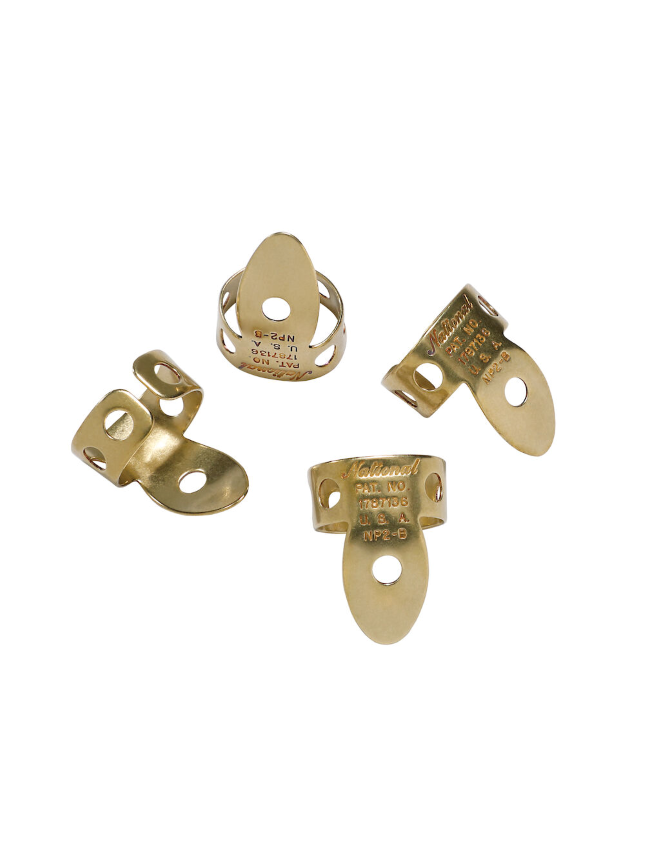 I plettri National in ottone per le dita producono un timbro caldo, suadente, dal volume e dalla definizione imbattibili. Ogni plettro è modellabile per poter essere adattato alle dita dell’esecutore.