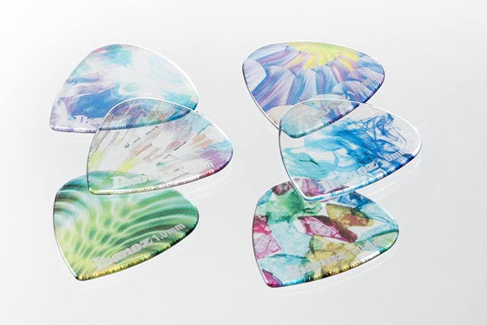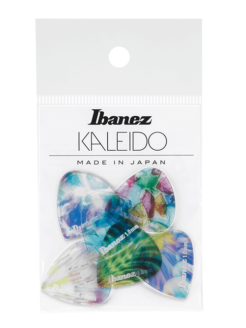 La serie di plettri KALEIDO è realizzata in un materiale copoliestere chiamato “Tritan” (“Tritan” è un marchio della Eastman Chemical Company, Tennessee, USA). Il Tritan è trasparente come il vetro, ma resistente e facile da modellare. Ibanez è la prima azienda a utilizzare questo materiale unico per i plettri delle chitarre. I plettri KALEIDO presentano grafiche audaci e colorate e un attacco sonoro più morbido, consentendo un controllo senza sforzo delle sfumature e del tocco. I plettri KALEIDO sono leggermente più morbidi rispetto ai plettri ordinari e sono disponibili in tre diverse spessori: medio pesante, pesante ed extra pesante.
