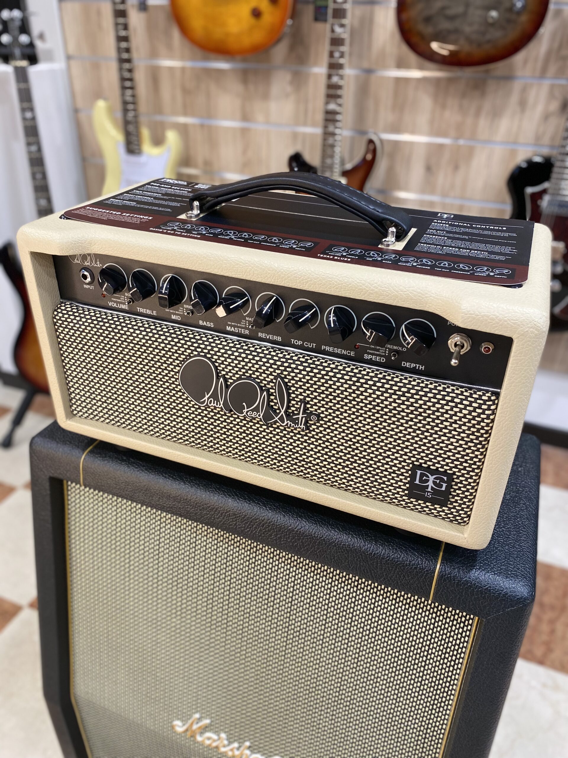 La PRS DGT 15 è una testata valvolare monocanale con una potenza di 15 W, con una serie di controlli che permette di passare da puliti cristallini a overdrive pesanti. Il pannello frontale ospita i controlli di equalizzazione a tre bande (Treble, Middle, Bass), un Bright switch a tre posizioni e i controlli Boost, Reverb, Top Cut e Presence. Lo switch Bright ha tre posizioni: on, off e una terza che attiva la modalità Bright disattivandola quando viene utilizzato il Boost, permettendo di gestire al meglio le frequenze alte. Il Master Volume può essere impostato su on, off o on solamente quando il Boost è attivo. Il circuito del Tremolo oscilla il bias delle valvole di potenza e dispone dei controlli Speed e Depth per una regolazione precisa. Il footswitch a 3 vie incluso permette di controllare il Boost, il Reverb e il Tremolo.